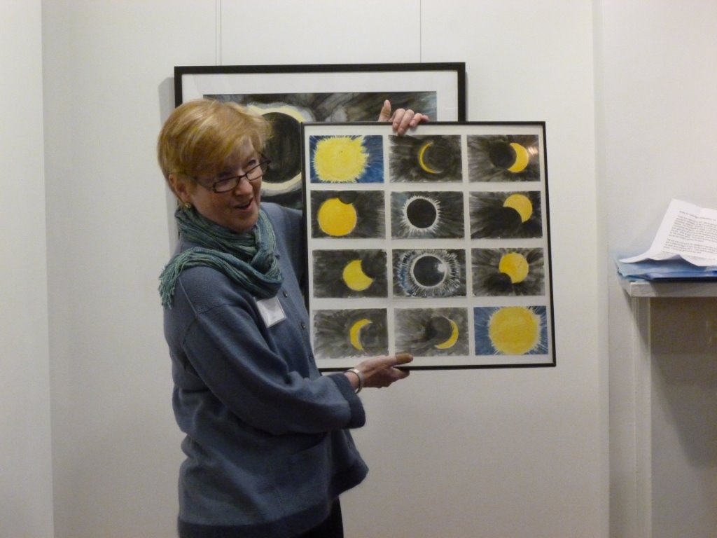 Beth took inspiration from a trip with Carolee to Greece this past summer. “The light of the sun prompted the work for this exhibit,” Beth writes. “In Skopelos, Greece, the night winds from Africa created cloud swirls and rough seas; in the morning, the sun’s light was refracted through ice crystals and fog, and then danced on the eddies and currents, strengthened by the moon high tide. In Glendo, Wyoming, we saw the solar eclipse, a unique event that was greater than the sum of its parts: the vanishing sun, the dark moon, the four minutes of night time at totality, the stunning corona, and the perfect joy at witnessing this rare occurrence. Using watercolors, drawings, sintra and screen prints, I have tried to recreate the sense of wonderment engendered by observing and researching these phenomena.”
