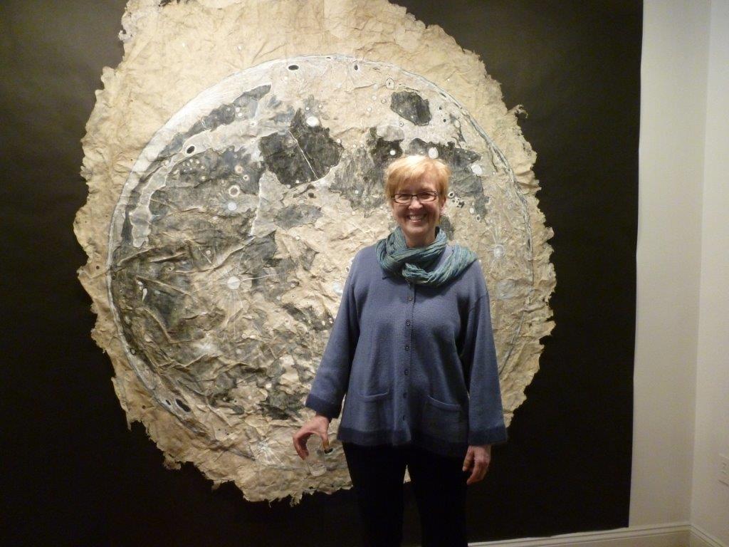 "Supermoon" (6'4"x6'4"): watercolor crayons, gouache paint, and wax crayons on overbeaten flax paper. Beth poured paper pulp onto a theatrical scrim laid down on the floor of her studio and allowed it to dry without pressing, creating the texture that adds depth to the detailed map of the moon. When asked what prompted the subject matter, Beth says some of her earliest memories are of her father getting her and her siblings up in the middle of the night to view an eclipse of the moon through his telescope.
