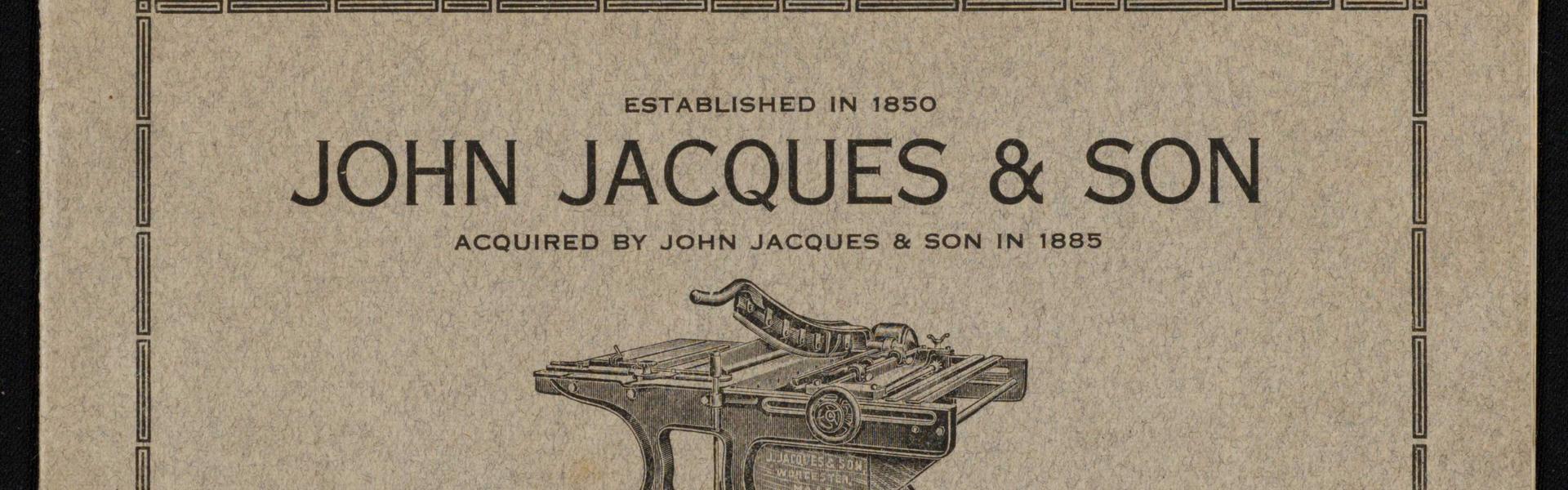The Jacques catalog belongs to the Joseph Newman Collection of Books on Bookbinding which is a resource and study collection comprised of nearly 200 printed book and catalogs on a range of topics including materials, book history, binding history, and bookbinding techniques that Joe collected during his long career. Joe kept the collection in the Book Conservation Lab at NEDCC during the years he worked here. It was donated to NEDCC after his death, where it remains a fantastic resource for staff.