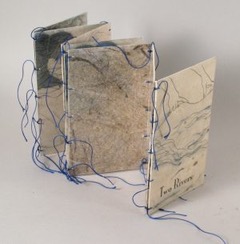 I entered Spark North Gallery in Denver to see This Time Is…, an exhibit of artists’ books by Alicia Bailey. I have known Alicia for many years through The Guild of Book Workers, and I interviewed her last year for our Rocky Mountain Chapter Newsletter. It was Alicia’s influence that sparked my interest and fascination in artists’ books. She is a champion for book artists and has done much to educate people about this art form, through her Abecedarian Gallery, the teaching and talks she gives throughout the country. One thing I like very much about artists’ books is that they can be a very intimate expression of oneself, so very personal, or they can be whimsical and just plain fun – but they always tell a story. Like most art, they have the power to touch people, and be a seed in one’s transformation. I love interesting and interactive structures, and I found that I was most enamored with the nature themes. I love Alicia’s artist book Two Rivers. She calls this a meander book structure. It incorporates blue threads in the sewing structure that remain attached and flow away from the book. The pages are beautiful earth-colored etchings under mica that include the text from Sam Hamill’s poem Mountains and Rivers without End. I feel a connection to the movement of water in nature – and feel it inside me as I move through life. My other favorite book in the exhibit was Forest Foraging. Alicia built a Plexiglas box, inserting narrow beakers that hold plants gathered from the forest. In the center of the box is a scroll, made of what looks like parchment paper with etchings of plants, emerging through an opening in the top when a knob is turned.